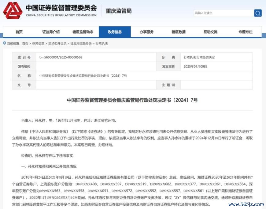 1月9日,重庆证监局披露的行政处罚书显示,湘财证券原总裁孙永祥存在四方面违法事实:一是知悉相关未公开信息情况;二是利用未公开信息交易;三是明示、暗示他人利用未公开信息交易;四是作为证券从业人员违规买卖股票。重庆证监局责令孙永祥依法处理非法持有的股票,没收违法所得721.29万元,并处1121.00万元罚款,及采取5年证券市场禁入措施。
