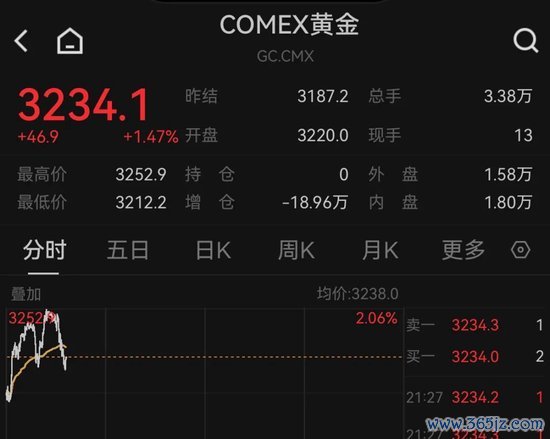 国际金价走势再度逆转,5月19日,现货黄金、COMEX黄金开盘一度直线拉升。截至9时40分左右,现货黄金涨超0.7%,盘中一度涨超1%,重回3240美元。