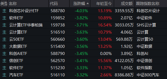 至于下跌一侧,年内涨幅领先的科技主题ETF,自然纷纷领跌。数据显示,它们的年内涨幅大致从上周的30%左右,整体回落至10%~20%。