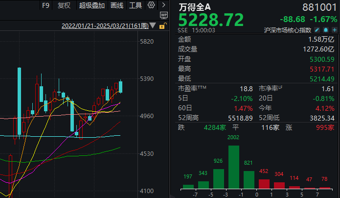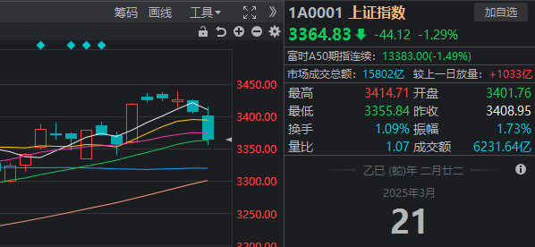 3月21日,市场全天低开低走,创业板指领跌,沪指失守3400点。截至收盘,沪指跌1.29%,深成指跌1.76%,创业板指跌2.17%。